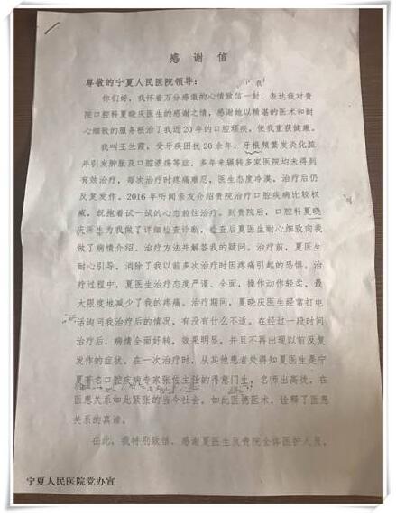 尽管如此,夏晓庆充分利用上班时间,耐心诊治每一个患者,从未抱怨。王兰霞就是夏医生的“铁杆粉丝”,她受牙疾困扰20余年,牙根频繁发炎化脓并引发肿胀及口腔溃疡等症,2015 年到2017年她一直跟随夏医生,经夏医生诊治后王女士的病情日渐好转。治疗期间,夏医生每周定期的电话问询更让王女士倍感温暖。