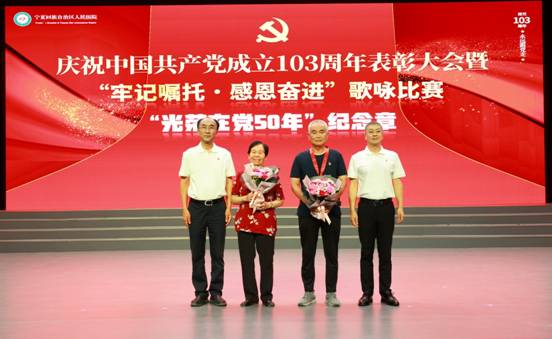 医院党委书记李银山,党委副书记、院长周玮为党龄在50年以上的老党员颁奖