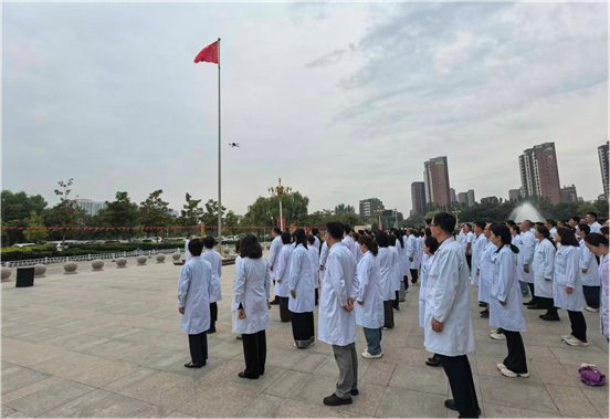 清晨的广场庄严肃穆,全体代表统一身着白大褂,党员佩戴党徽,队列整齐,精神饱满。