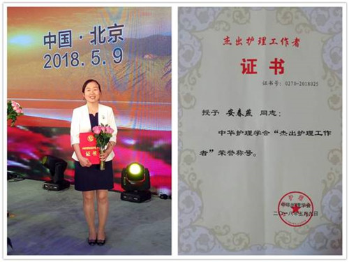 为进一步弘扬南丁格尔精神,落实健康中国战略,宣传护理工作者甘于奉献、爱岗敬业、敬佑生命、大爱无疆,为人民群众提供优质服务的先进事迹,激励广大护理工作者为推动我国护理事业发展、助力健康中国做出更大贡献,中华护理学会从各省、自治区、直辖市及部队系统中推荐的158名候选人中评选出60名“杰出护理工作者”,并于2018年5月9日在北京进行表彰,我院安春燕护理主管为我区唯一一名获此殊荣的护理工作者。