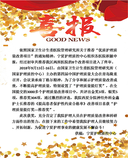 我院优质护理质量改善项目喜获“中国护理质量提灯奖---推荐奖”